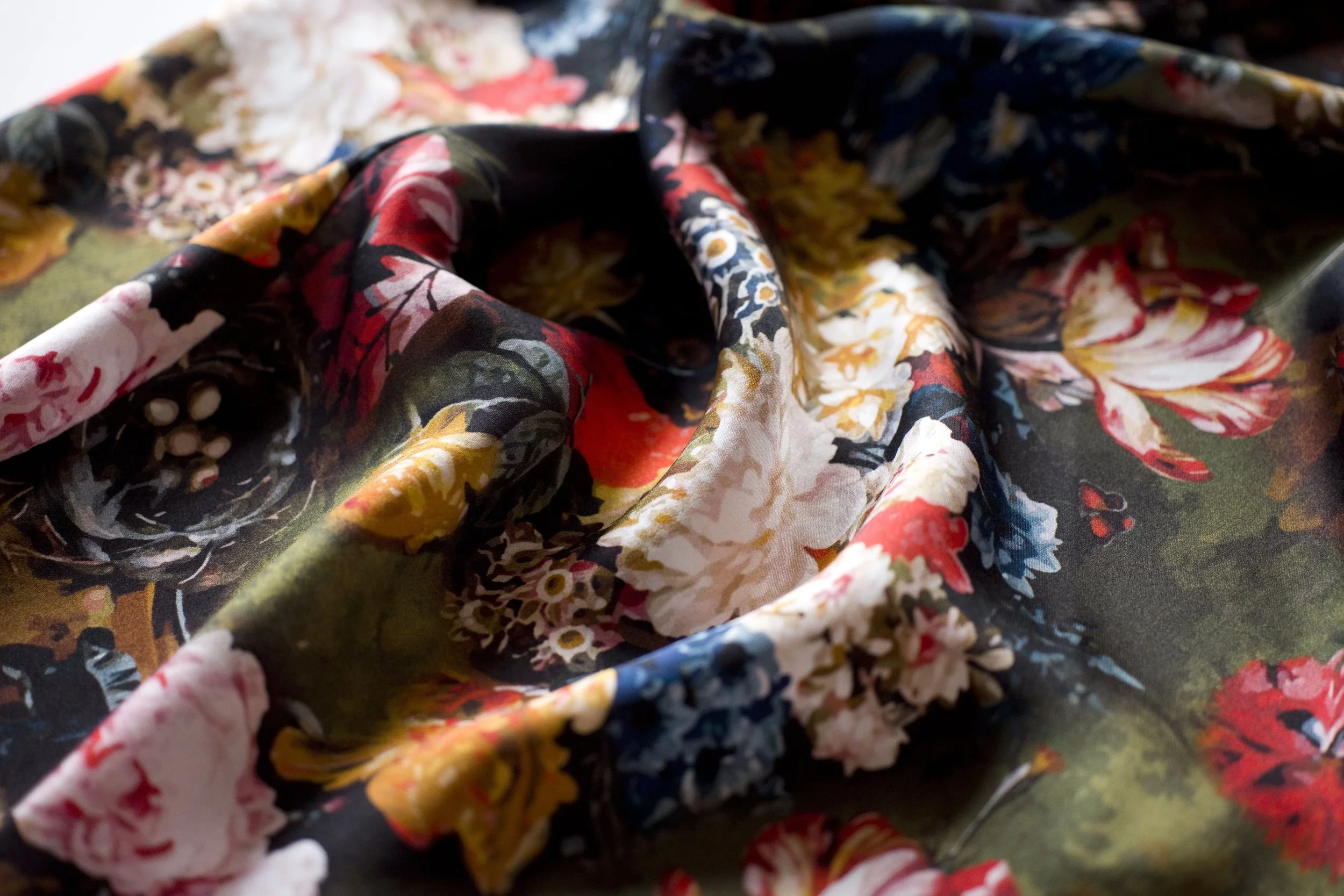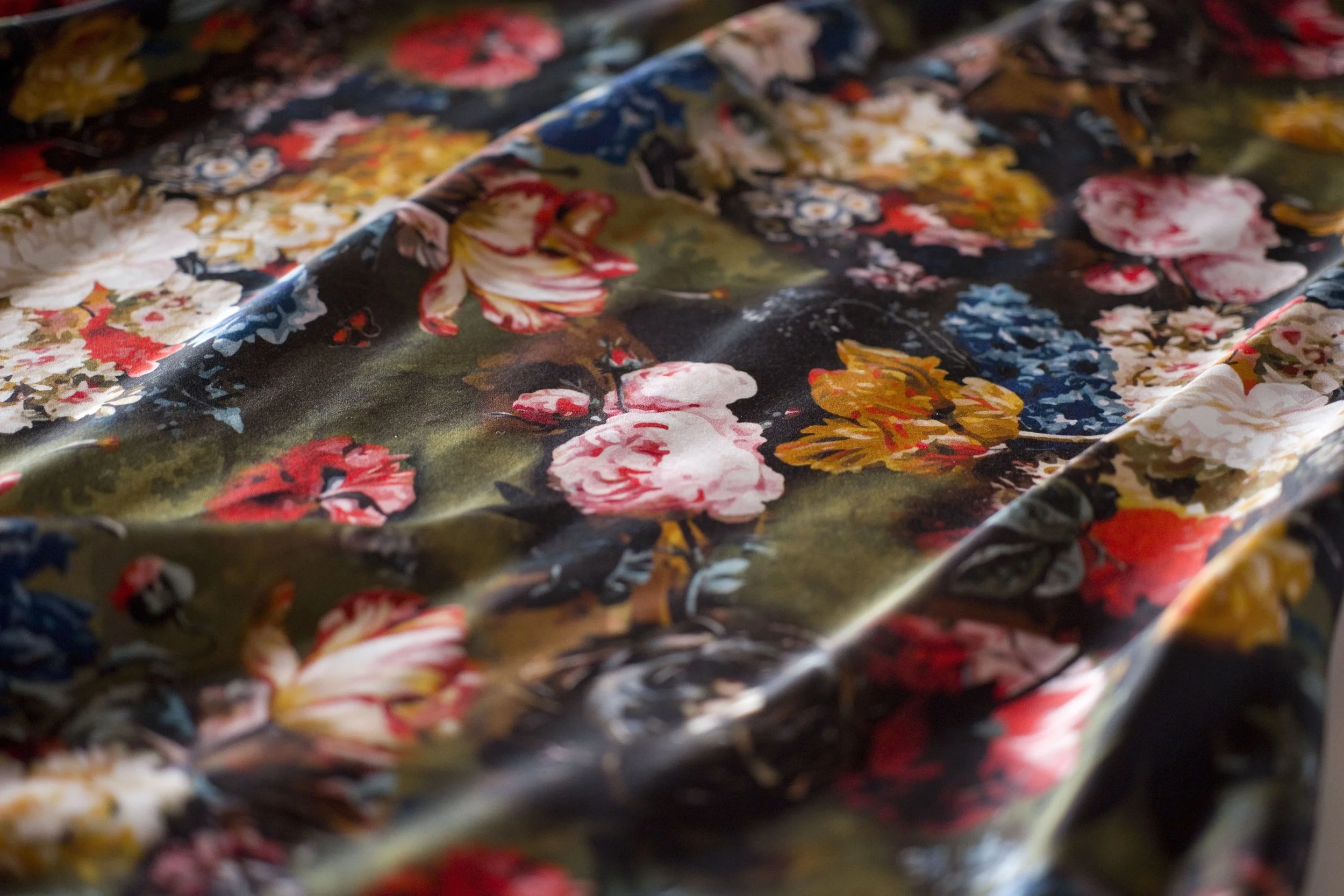 This work of art print is inspired by mother natures four seasons with greenery, pink peonies, birds nest with eggs, bluebells, lilies, poppies, blossoms, all sorts of blooms hence its name ‘Work of Art’. Other shapes including a robe and chemise with lace appliqué also in this fabulous print.